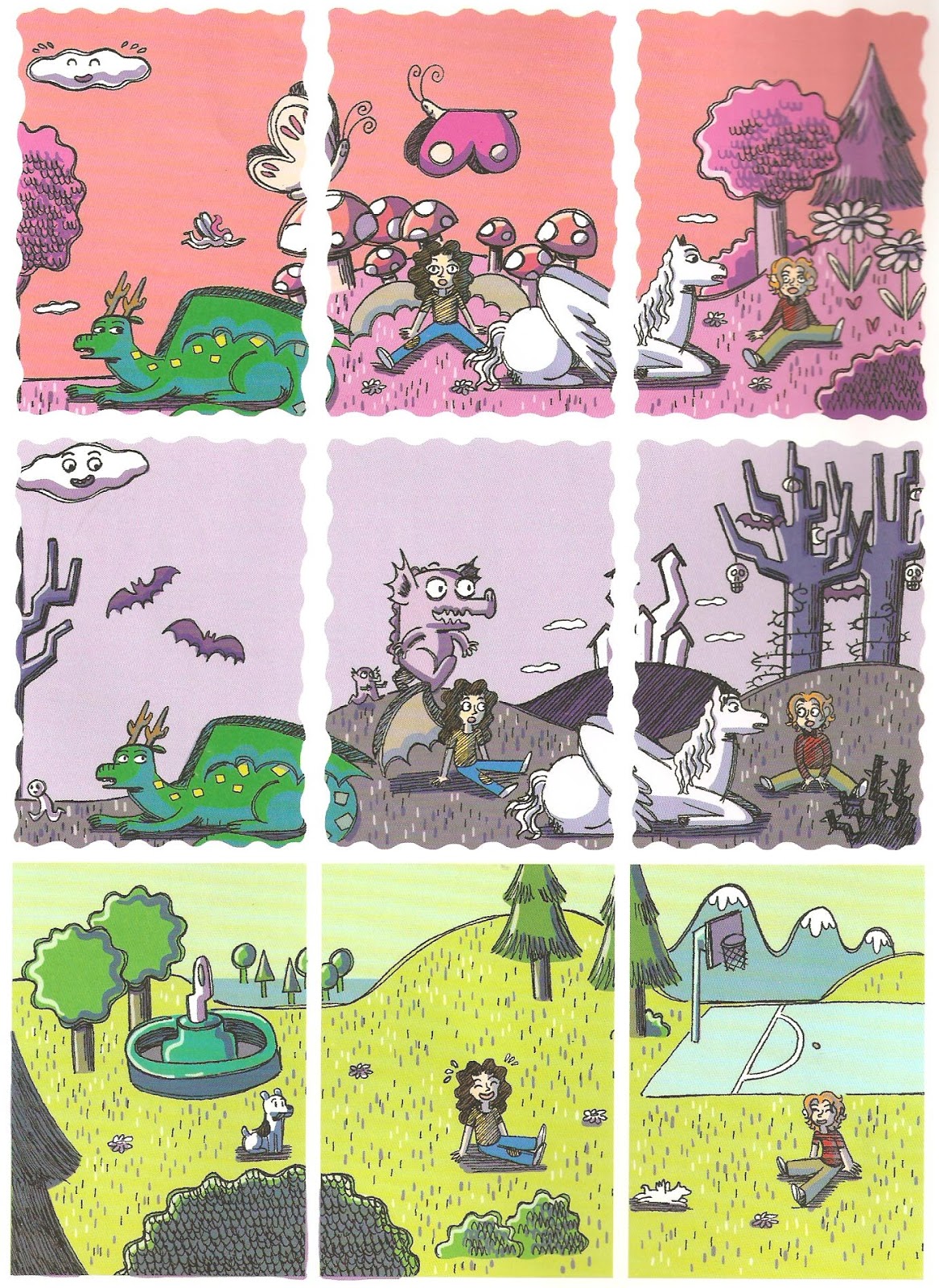 The middle row has a kid fantasizing as various flying creatures in a dark fantasy world...